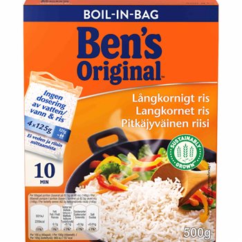 Ben's Original™ Long Grain Rice is perfect every time! And it even only takes 10 minutes! Boil-in-bag also saves you the trouble of measuring water - without the risk of the rice burning. We source our long-grain rice from the sunny fields of Spain and Italy. This type of rice is characteristically airy, does not 'stick' and is at the same time more robust than the Asian varieties. The more neutral taste and aroma make it an obvious accompaniment to all kinds of stews, in salads and as fried rice.