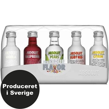 Smart pakke med 5 forskellige små vodkas fra absolut med 40% alkohol. Pakken indeholder smagsoplevelser originale (blå), citron, koriander og vanilje. Den svenske producent har solgt absolut siden 1879, der produceres i henhold til en mere end 400 år gammel opskrift på både destillation og aromatisering. Denne 5 -pack skal købes af dem, der ønsker lidt forskellige smag at vælge imellem - men det er også en dejlig gaveide.