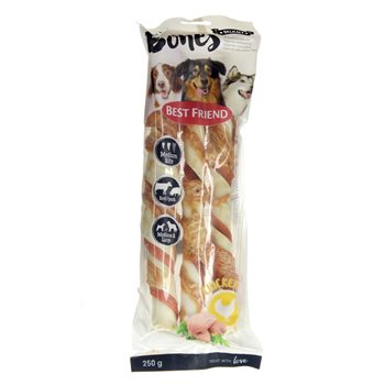 25 cm lange tyggeløb fra bedste ven til mellemstore og store hunde. Rullerne er lavet af hud fra svin og okse, hvilket giver dem en hård bid, som din hund kan have det sjovt med i lang tid. Indpakket i kyllingefilet.