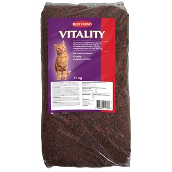 Denne store taske indeholder 15 kg tør mad til din kat. Denne mad stammer fra den velkendte producent bedste ven, som i mange år har gjort nærende og sund mad til både katte og hunde. Du er derfor sikker på, at din kat får masser af god ernæring, når du vælger den bedste ven vitalitet tør mad.