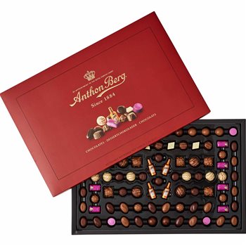 Trate a sus invitados a exquisitos chocolates de postres de Anthon Berg. La gran versión diplomática contiene 1000 gramos de chocolates muy diferentes, por lo que hay algo para cada gusto, ya sea que le guste el pleno o más sustancial, crujiente o caramelo, claro u oscuro.
