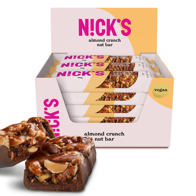 Nicks Keto Bar Almond Crunch, barra de nuez de almendras de chocolate vegano, 173 calorías, 2.8 carbohidratos netos, sin azúcar agregada, dulces sin gluten, bajos carbohidratos (12x40 g)