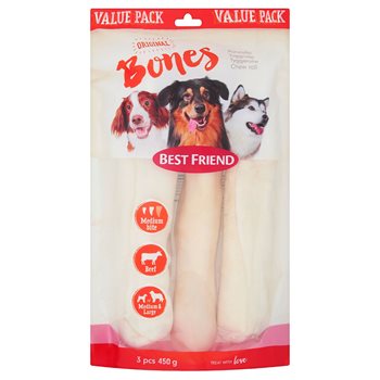 Il migliore amico Bones BigBite in White è una variante popolare del rotolo di masticazione. Questo tipo di rullo da masticare ha una lunghezza di 28 centimetri, il che rende questi rotoli molto adatti ai cani leggermente più grandi.