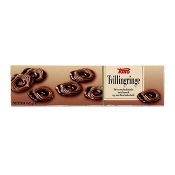 De velsmakende, deilige tvillingringene fra Toms fabrikk er perfekte som sjokoladetilbehør til desserter. Tvillingringene er laget av to komposittlag med lys og mørk sjokolade. Kan inneholde spor av nøtter. Inneholder 62 g.