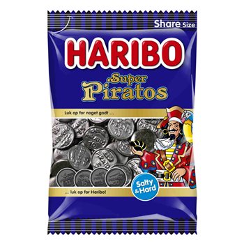 Super Piratos från Haribo är runda, hårda och extra starka lakritsdukater. Smaken är snyggt salt med en touch av Salmiak, och de varar länge i munnen. Super Piratos är en tydlig favorit hos alla lakritsälskare. Inte lämplig för barn.